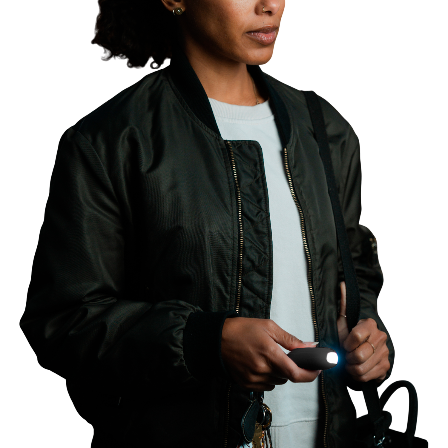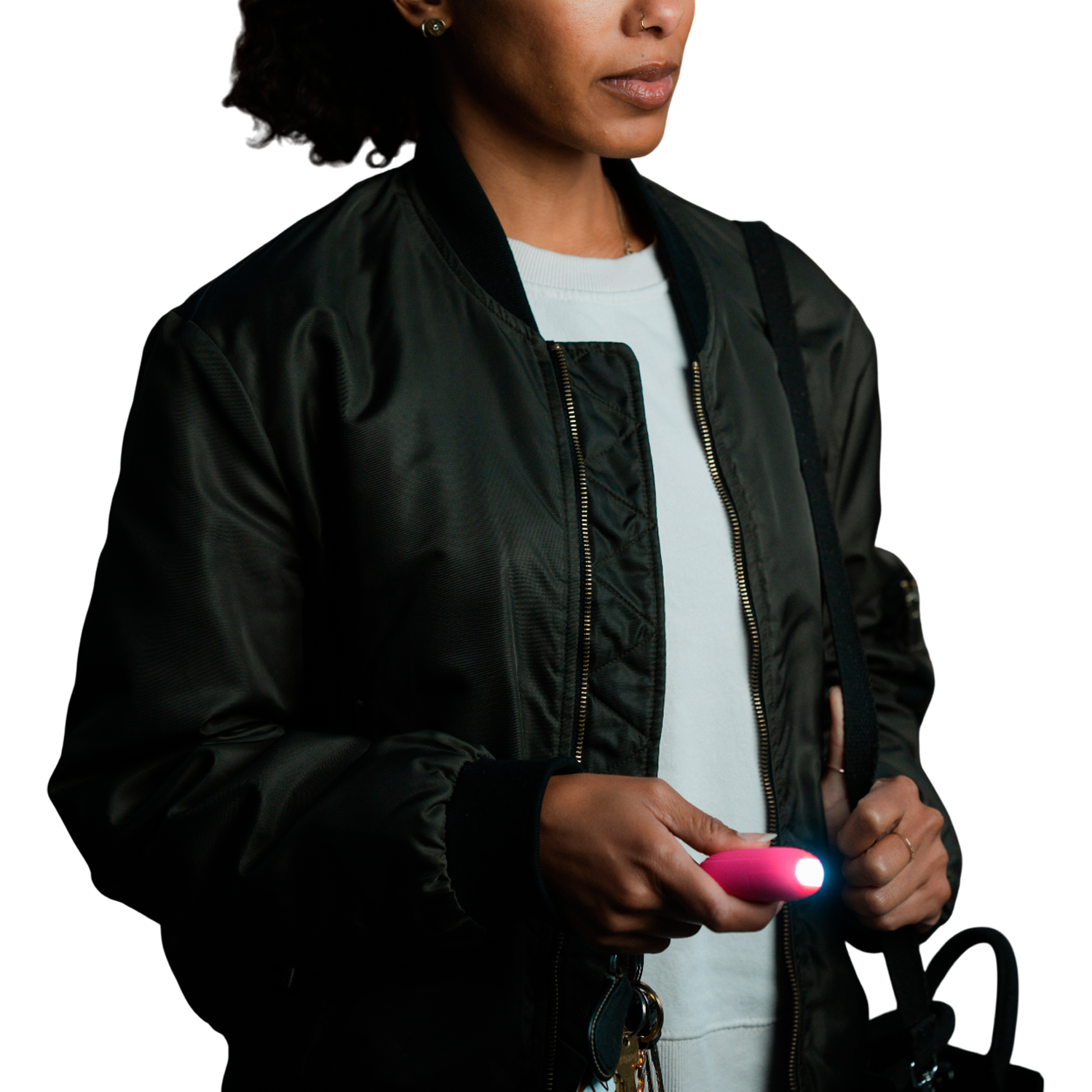 Incluye una lámpara LED funcional que sirve tanto para iluminar como para desorientar visualmente al agresor. Todo en un tamaño ultra compacto, liviano y con enganche tipo llavero para llevar en cartera, mochila o cinturón.