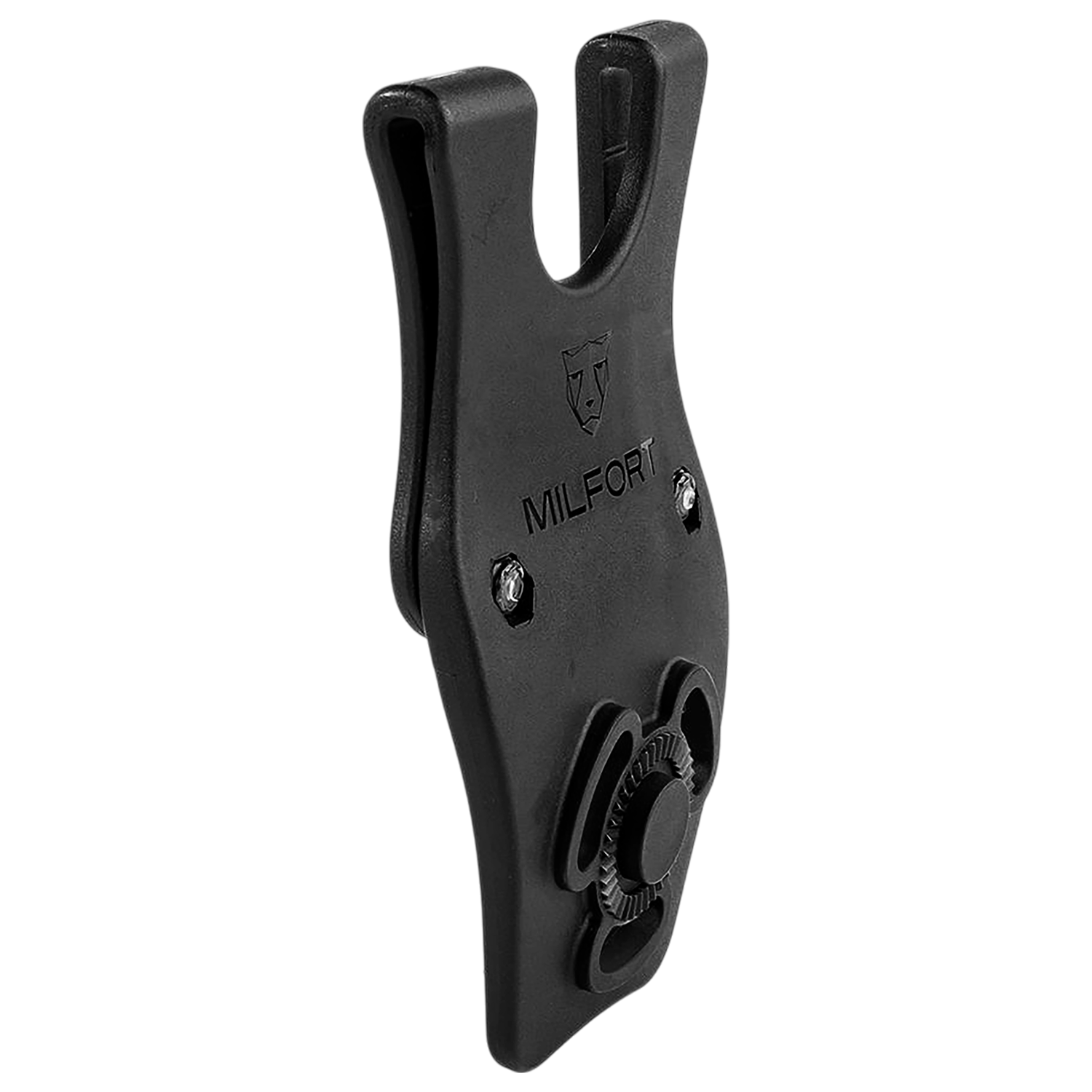 Ideal para uso en cinturones multipropósito fabricados en reata, su enganche de perfil bajo permite el uso de chaquetas sin interferir con su funcionamiento. Compatible con todas las portas en polímero MILFORT.