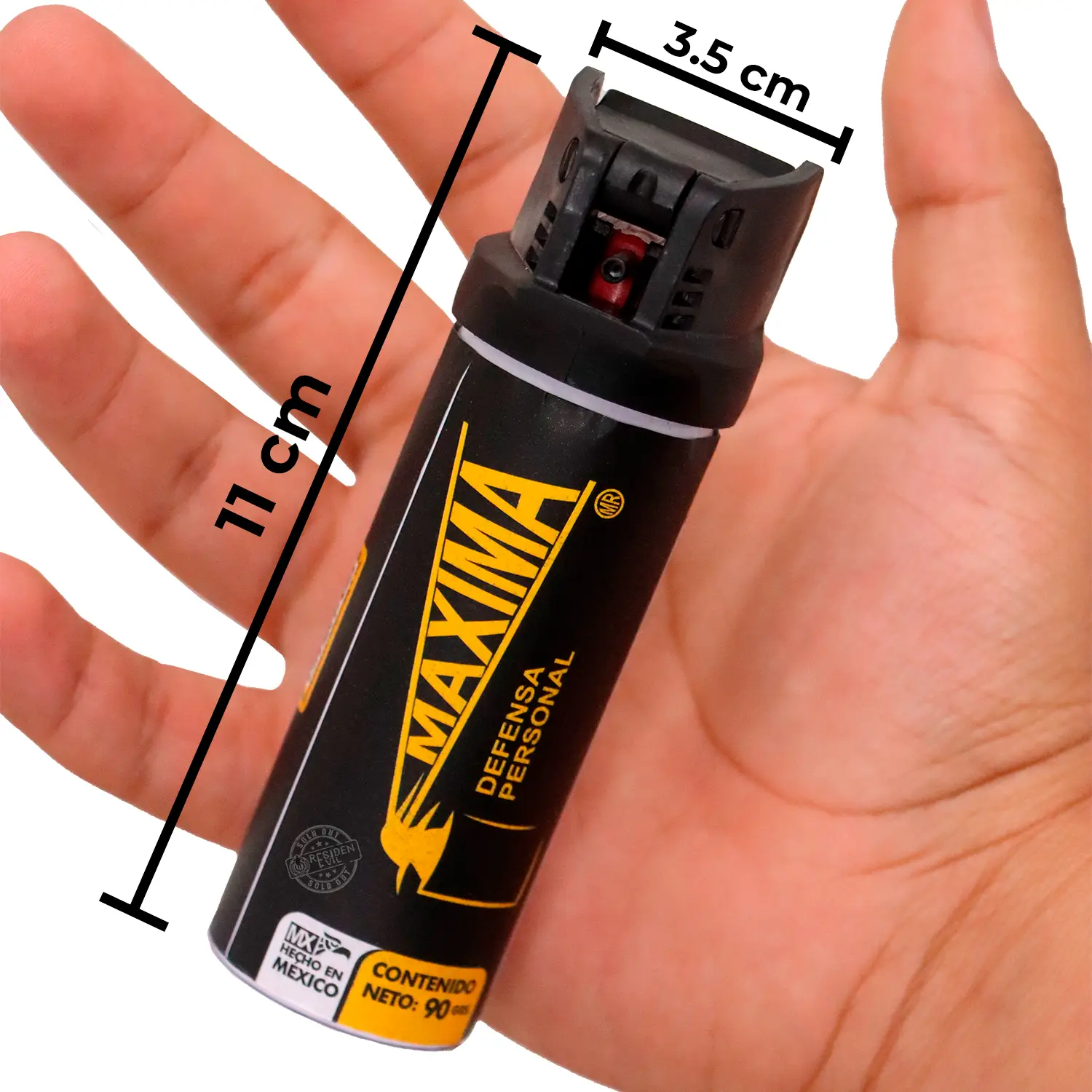 **Potencia y Eficacia:** Formulado con ingredientes de máxima potencia, el gas pimienta lacrimógeno Máxima garantiza una respuesta inmediata ante cualquier amenaza. Su capacidad de 90 gr asegura múltiples aplicaciones, brindando una protección prolongada y efectiva.