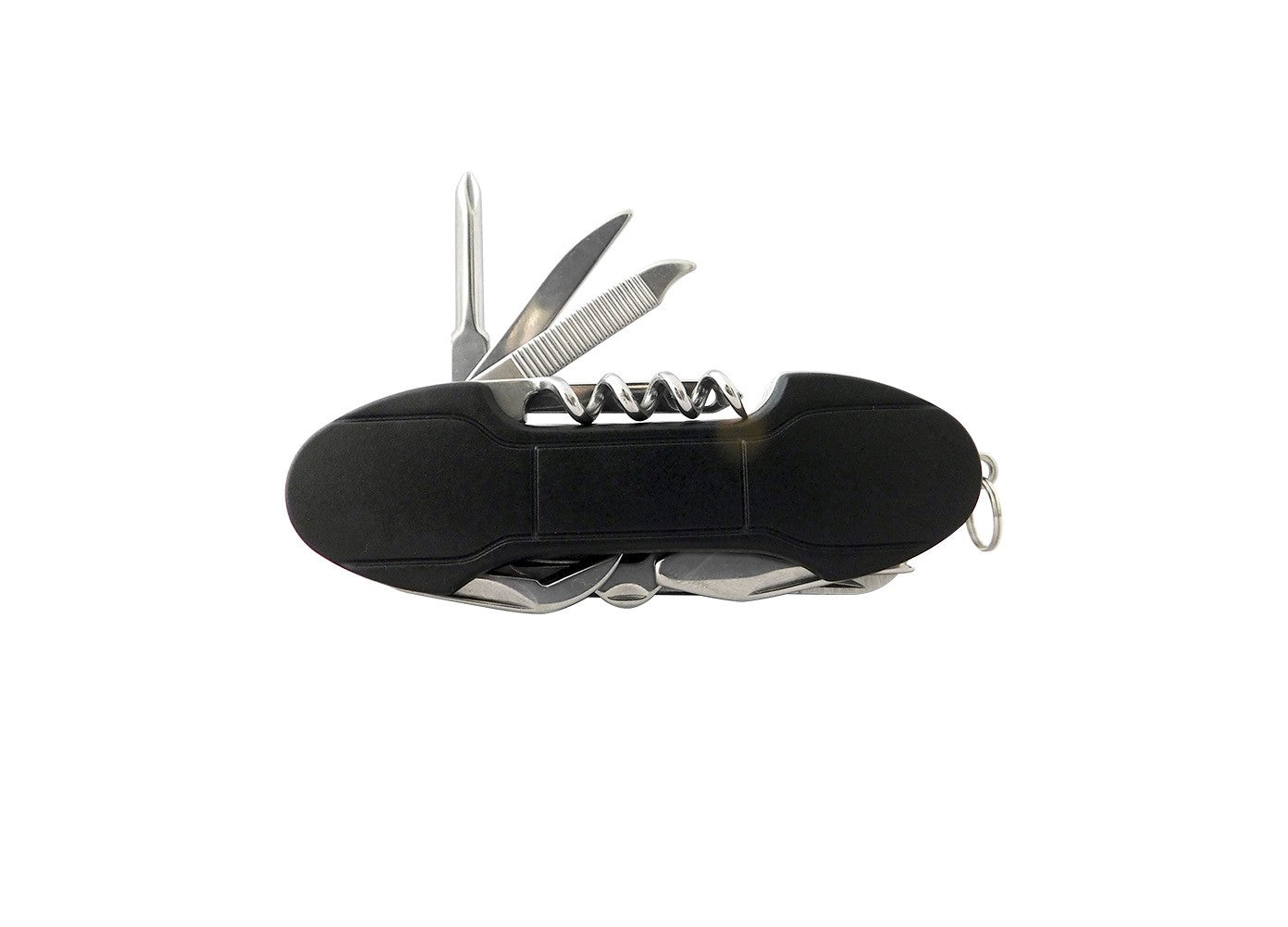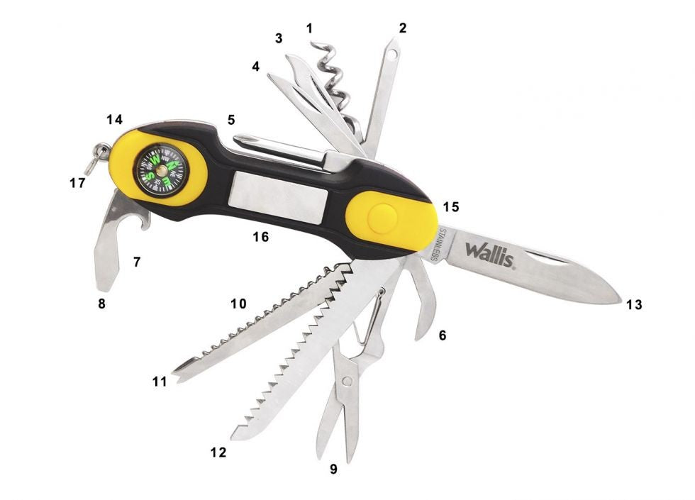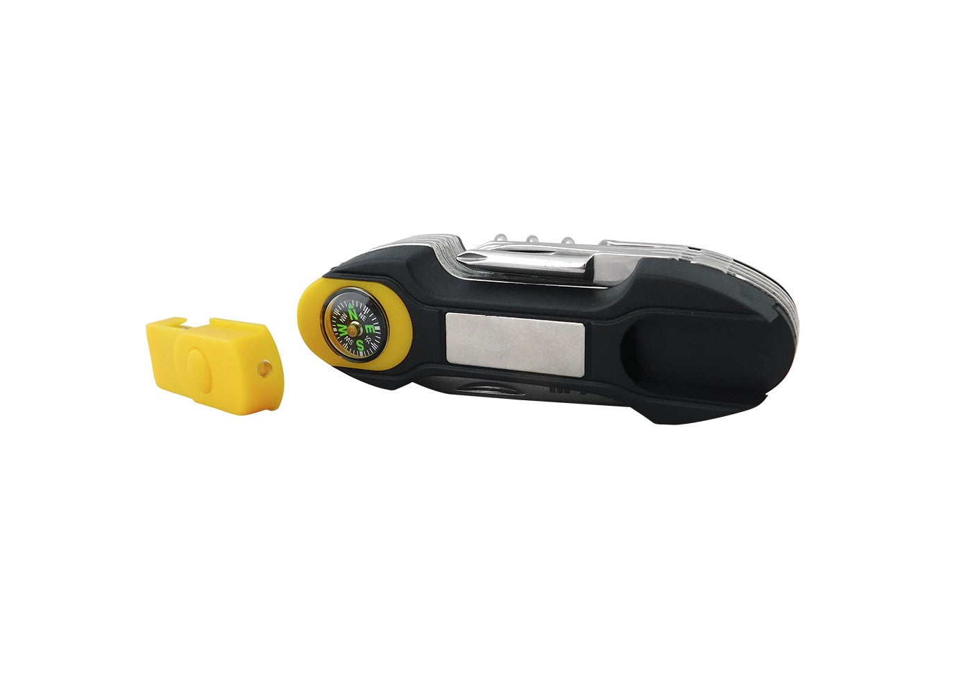 CaracterísticasMultiherramienta de acero inoxidable, dureza 48-52No incluye Funda17 usos:1.- Sacacorchos2.- Tensor de cables3.- Lima para uñas4.- Punzón5.- Mini desarmador de cruz6.- Abrelatas7.- Destapador, con:8.- Desarmador plano de 3 mm9.- Tijeras10.- Quita escamas, con:11.- Saca anzuelos12.- Sierra de 6 cm13.- Hoja de 5.5 cm14.- Brújula removible15.- Luz LED removible16.- Reflejante sobre cacha17.- AnillaMango:ABS negro con amarilloLargo cerrada:9 cmLargo abierta:18 cmPeso:140 gPresentación:Caja de cartón