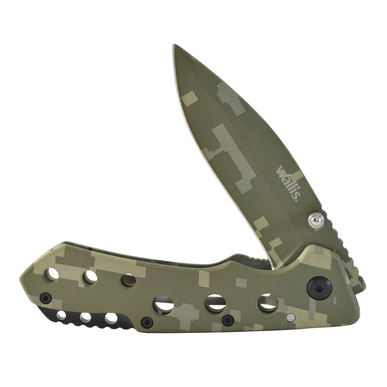 Navaja de bloqueo de acero inoxidable, dureza 54-56, con clip Navaja de bloqueo camuflaje verde. En el mango tiene un clip para que la lleves cómodamente ya sea en la cintura, en tu vestimenta o en donde la quieras tener a la mano. Características: Hoja: Lisa Mango: Metal con clip Bloqueo: Manual con tornillo de apoyo Medidas: Largo de hoja: 7.5 cm Largo cerrada: 11 cm Largo abierta: 18.5 cm Peso: 110 g