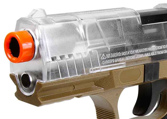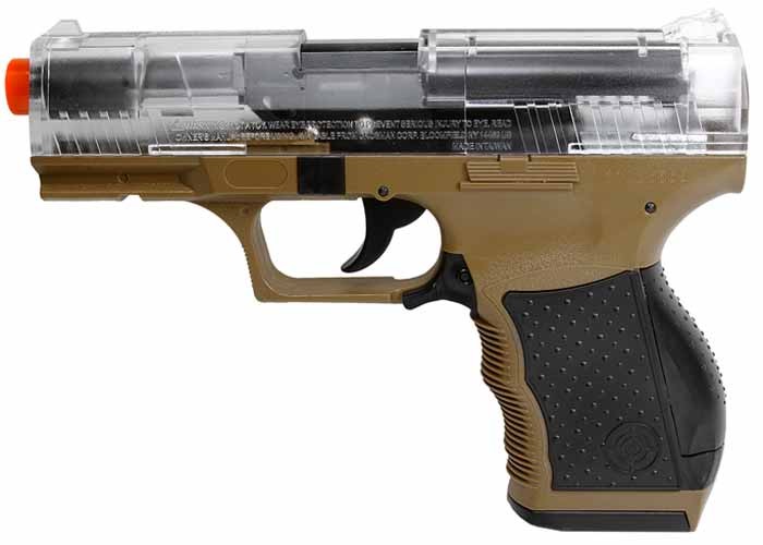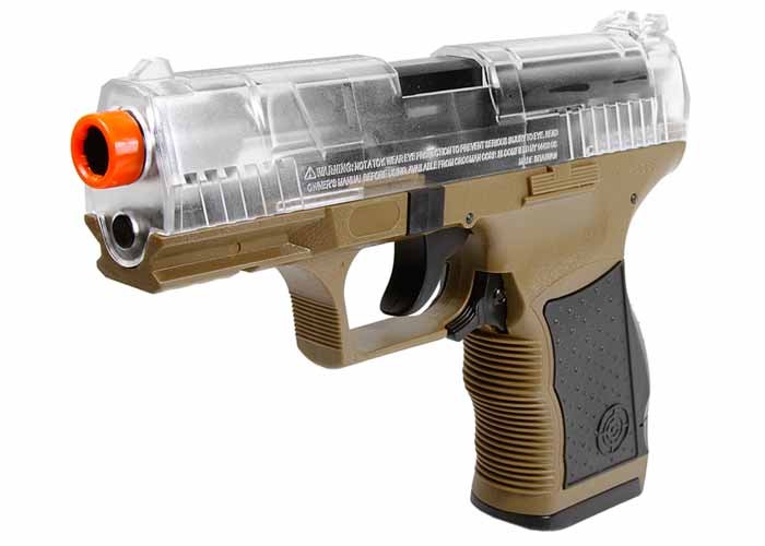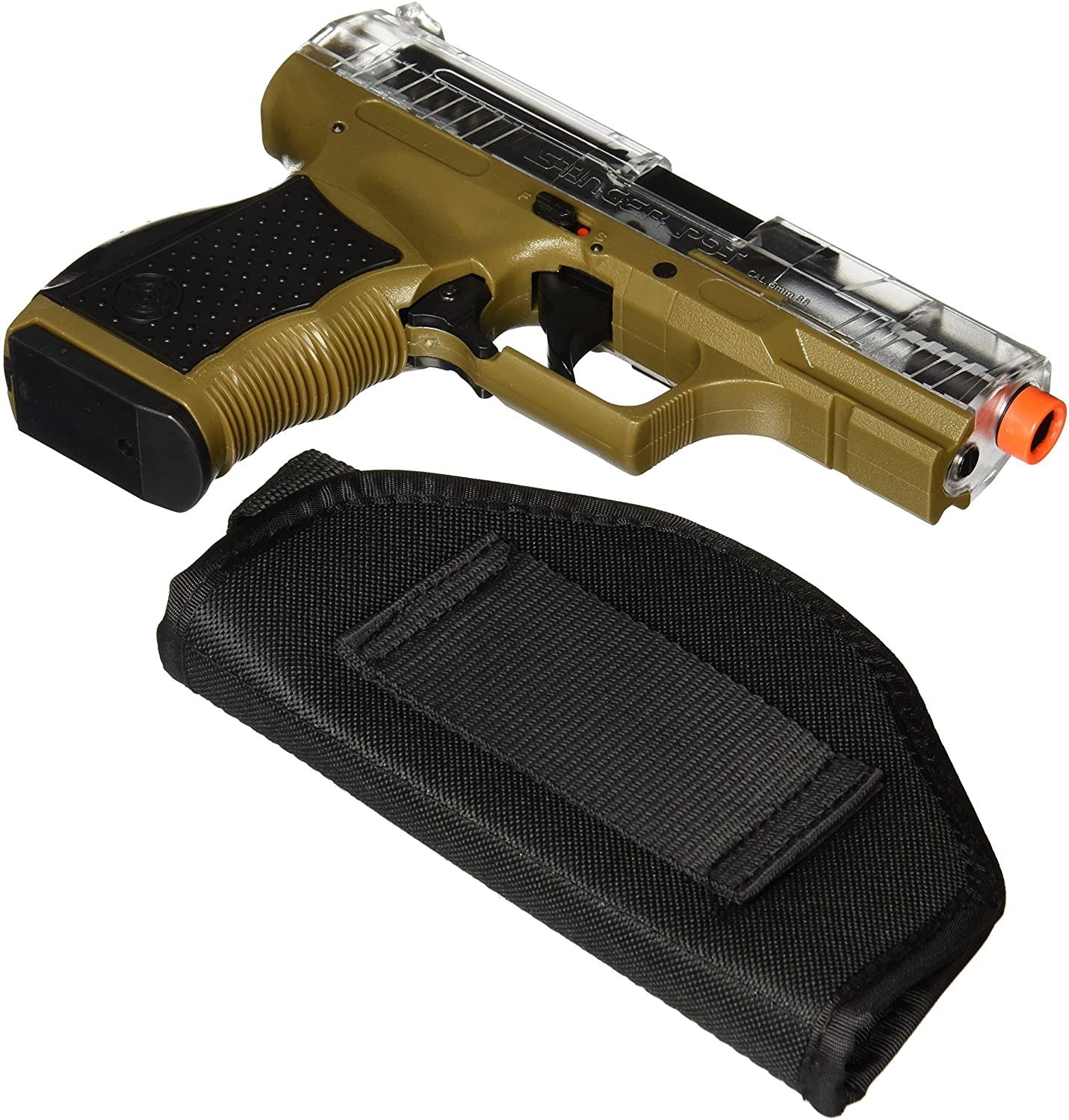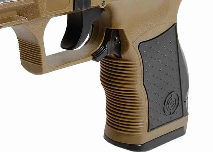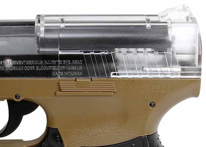 La pistola P9T es una pistola de resorte de disparo y disparo que dispara a velocidades de hasta 275 fps. Incluye un clip de 15 rondas, sistema de propulsión hop-up y un riel Weaver debajo del barril. La funda está hecha de suave tela de cordura y presenta un cierre de velcro para el pulgar. También se incluye en el kit un paquete de prueba de BB de airsoft de .12 g de alta calidad.