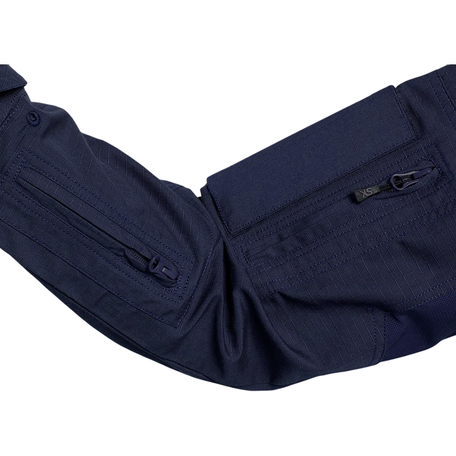 CARACTERÍSTICAS Bolsas amplias en la parte superior de la manga de 6” ancho por 7” de altura con cartera con cierre de complement de Velcro®. Bolsillo interior en el codo para acceso de codera de neopreno. Tela de respiración con corte irregular tipo mesh en ambas axilas y parte minima hacia la espalda. Puños con ajuste de Velcro® y corte en semiluna para ajuste perfecto de altura y protección. Cierre frontal YKK ® con jaladera plastic. Los bolsillos cuentan con doble compartimiento en su interior. Porta lapiceros triple en la parte inferior de la manga izquierda.TALLASCH 34 60 KGM 36 70 KGG 38 80 KGXG 90XXG 100 MAXIMO 112SON SPANDEX.