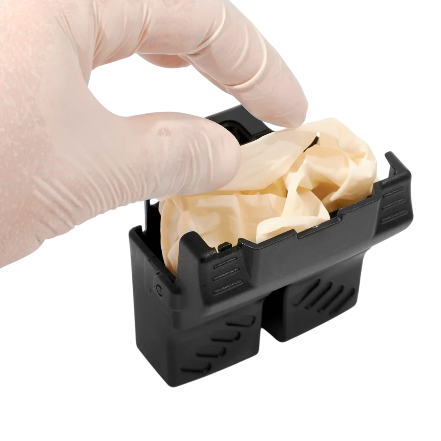 Su compartimento hermético resguarda hasta 2 pares de guantes de látex, evitando la exposición a polvo, líquidos o agentes biológicos, manteniéndolos estériles hasta el momento de uso.
